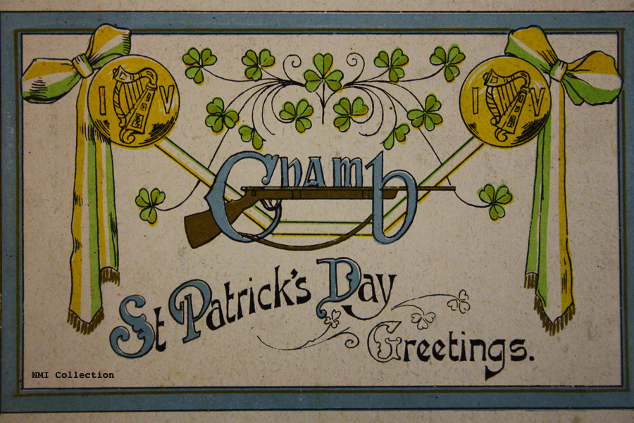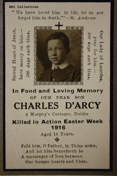 Anyone who’s been listening to RTE’s The History Show recently will have heard about the making of a list of the children who were killed in Dublin during the 1916 Rising. Joe Duffy began to compile this list as a result of a collaboration with the Jill and Jill Foundation (a children’s charity) and has requested listeners to contribute any information about these children and how they died. Working with various historians and record holders including the General Records Office, Glasnevin Cemetery and the National Museum of Ireland, the list currently stands at 38 children under the age of 16. Given that about 390 civilians died in the week of the Rising (not counting the rebels, police and army), the children represent about 10% of those who died in the various battles and crossfire throughout the city and suburbs. Some of these children were themselves attached to organisations such as Fianna Eireann (14 year old Sean Healy), and the Irish Citizen Army. One member of the ICA was Charles Darcy, a 15 year old from the Gloucester Street area who died on Monday 24 April, the first day of the Rising. This is his memorial card, which was donated to the National Museum along with a small collection of other papers by his mother, Elizabeth Darcy, in 1970.