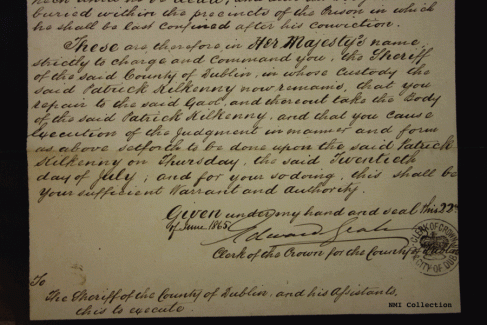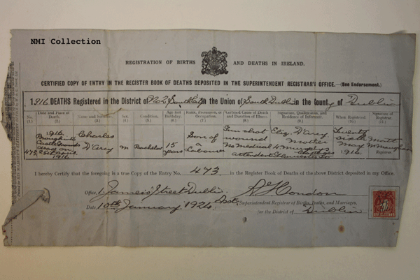 The details of Charles’ death are contained in a letter from Elizabeth to Lieutenant A. Rasdale of the Office of the Adjutant General in 1923 during the process of claiming a military pension on Charles’ behalf. Charles was under the command of Captain Sean Connolly in the City Hall garrison, and was allotted to a section under Sergeant E. Elmes to take possession of Henry & James’ premises (a clothiers) as a support to City Hall itself. He met his death on the roof of those premises on the evening of Easter Monday. Charles was shot by a British military sniper from a position around Dublin Castle, and his body was brought into the grounds of the Castle on Tuesday 25 April. His death certificate lists his cause of death as a gunshot wound, and notes that there was no medical attention. It also states that his mother Elizabeth was informed of his death as the next-of-kin.