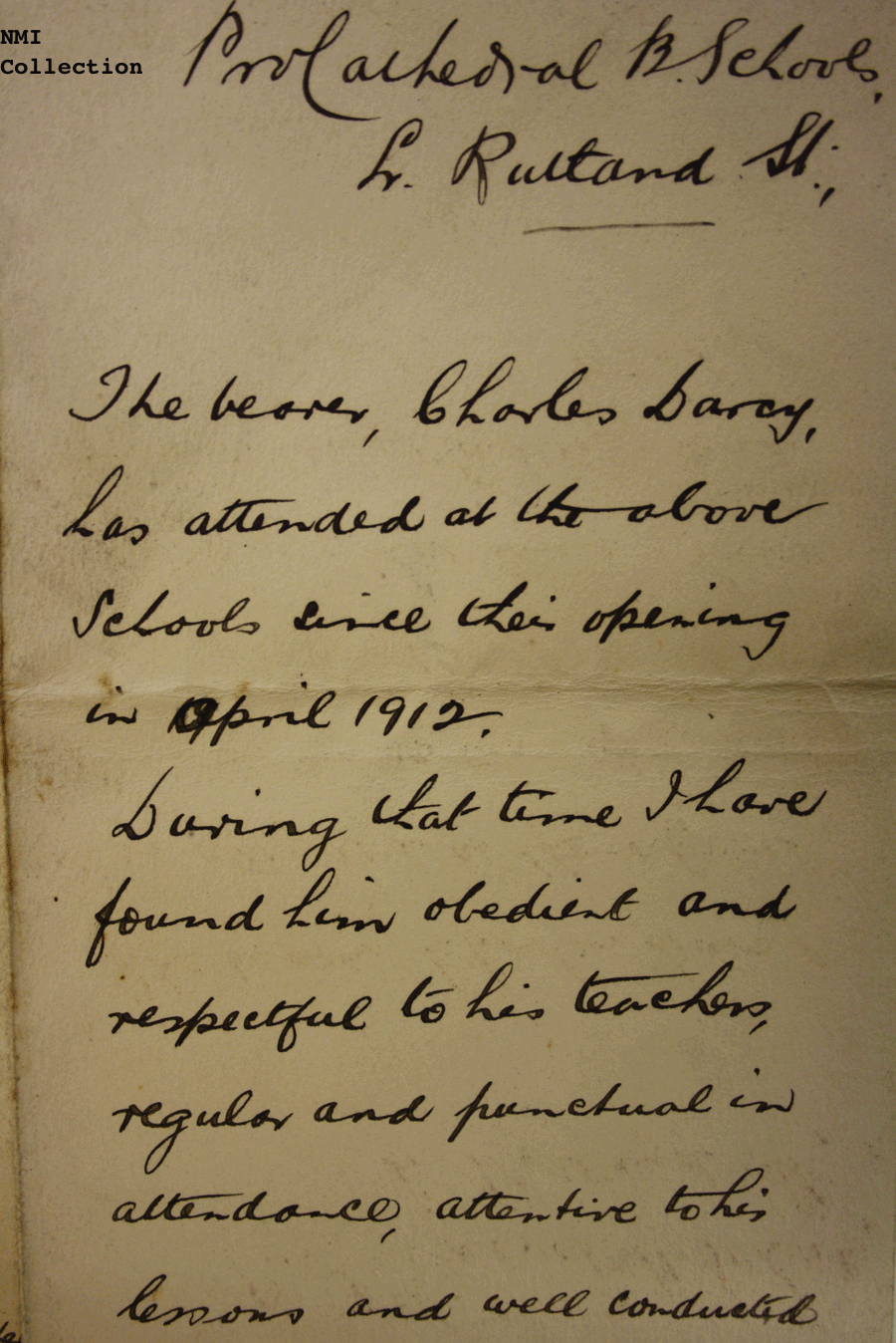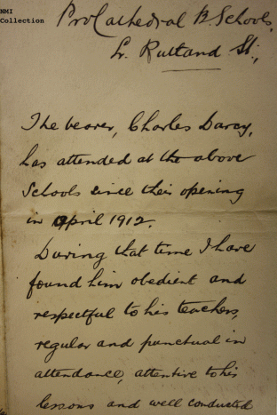 Charles had attended the Pro-Cathedral School on Lower Rutland Street since it was opened in April 1912, and was educated there until May 1914, when, at age 13, he was no longer obliged to attend school. A letter of reference written by his schoolmaster Mr A. Scully describes him as obedient and respectful to his teacher, regular and punctual in attendance, attentive to his lessons and well conducted in every respect. He was also a member of the Boys’ Sodality attached to the Pro-Cathedral on Marlboro Street, and attended regularly to his religious duties. Having left school at this age, which was normal in the early 20th century, he found work in a draper’s shop as an assistant. He also appears to have joined the Irish Citizen Army around this time. When the rebellion broke out, he reported for duty at Liberty Hall.