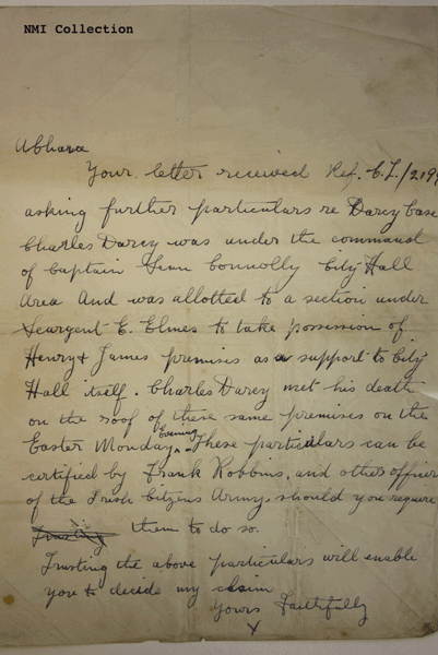 After the formation of the Irish Free State the Military Service Pensions Act (1924) was instigated, and any persons with proven service during the 1916 Rising and the War of Independence were to be awarded a Certificate of Service and were also entitled to a military service pension. In 1923 Elizabeth started the process of claiming the pension on Charles’ behalf, which resulted in a series of written communications between her and the Ministry of Defence.