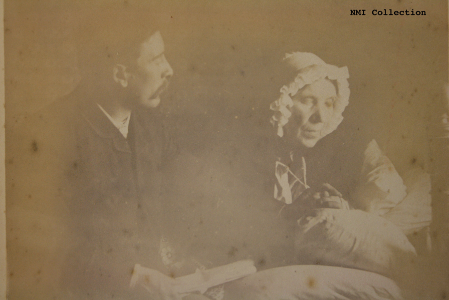 When Hamilton and his men came to the Darcy household, they found Mrs Darcy on her sick bed. The photographer captures some moments inside the cottage. In one, Daniel Crilly, the Irish nationalist M.P. for North Mayo, consoles Mrs Darcy, and another shows Mrs Darcy with her daughter.