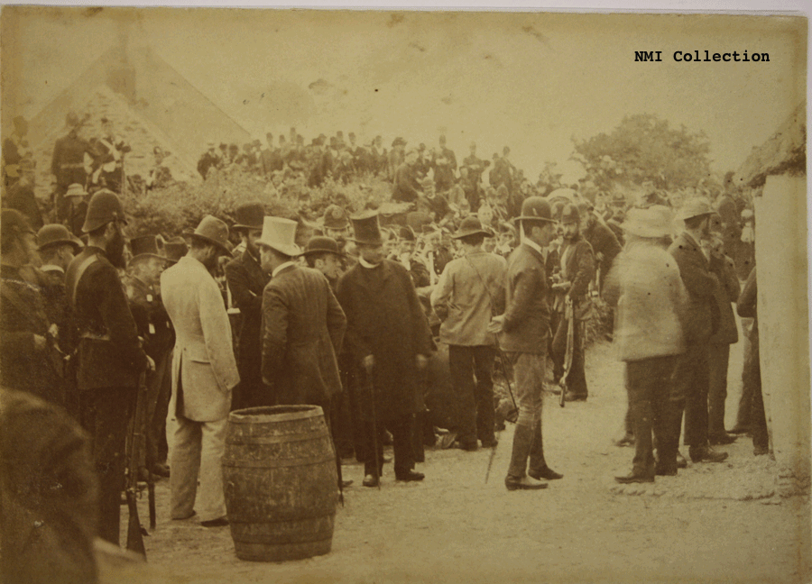 Another photograph shows a crowd gathered outside her cottage, described by the caption writer as ‘A council of war over Mrs Darcy’s eviction’, including friends and enemies. A crowd of onlookers are seen on higher ground, being kept back from the house. Members of the Royal Irish Constabulary, armed with rifles, can be seen to the far left. In front of them are leading nationalists Daniel Crilly M.P., John Dillon M.P. and Michael Davitt. Captain Hamilton, the evicting agent, is seen leaning on his stick talking to Captain Slack, the magistrate in command. In the background a group of Emergency Men are waiting for the word. The caption also reads that Captain Hamilton receives a telegram, and postpones the eviction.