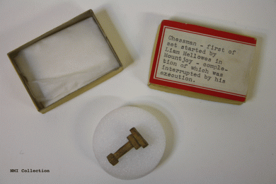 Mellows’ chess piece is one of the many emotive objects in the National Museum’s Historical collections. When it arrived in the museum it was in a box labeled by the donor ‘Chessman – first of set started by Liam Mellowes in Mountjoy – completion of which was interrupted by his execution’. The piece is small, just over an inch high, but every groove and scratch Liam carved can be clearly seen. It’s almost impossible to hold this object without wondering what he was thinking and feeling when he was making it. The executions of 8 December were not the first so he must have known his death was a possibility. However, he had been in prison since July and had not yet been tried in a court for his part in the siege of the Four Courts. This chessman should have been the first of a set of 32 pieces, and I wonder if he thought he would have the time to make the full set. His choice to carve a pawn may have some meaning, though it may also be completely coincidental.
