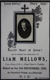 Mellows was a vocal opponent of the Anglo-Irish Treaty, believing that it undermined the principle of the Republic which had been fought for. On 14 April 1922 an Anti-Treaty Republican garrison, led by Rory O’Connor and including Mellows, Dick (Richard) Barrett and Joe McKelvey, took the Four Courts. The siege lasted over two months, ending when Free State Forces bombarded the building, forcing a surrender on 30 June. Some escaped and continued the fight on the city streets, but Mellows, McKelvey, Barrett and O’Connor were taken captive and interned in Mountjoy as prisoners of war.