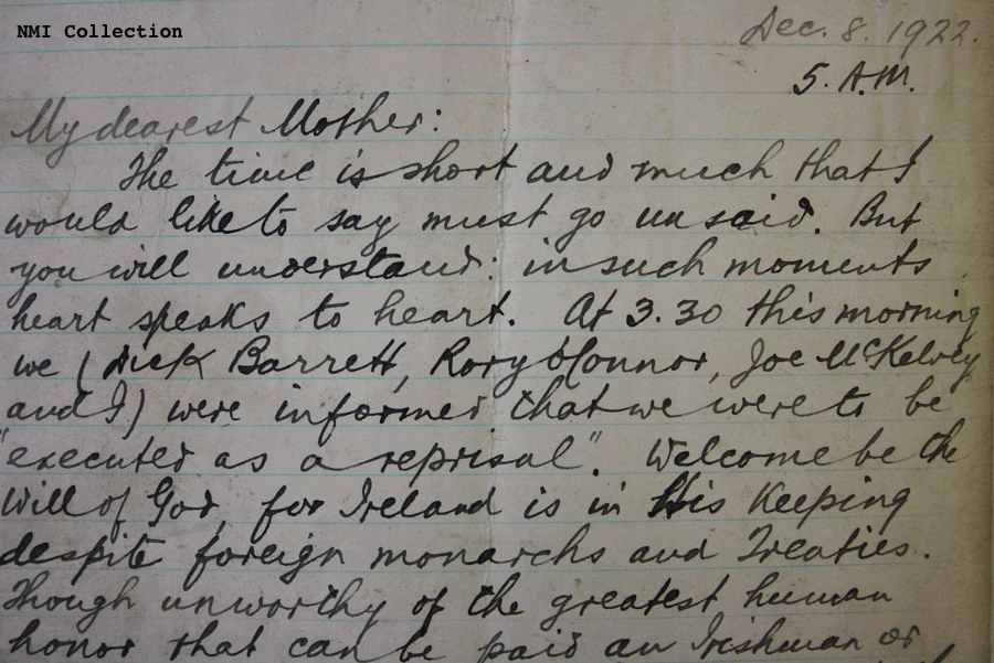 The decision to execute Mellows, McKelvey, Barratt and O’Connor as a reprisal for the killing of Sean Hales on 7 December was sudden, and the men were told they were to die less than five hours before the event. Mellows took this time to write a number of last messages to loved ones. At 5am he wrote to his mother Sarah Mellows, starting with the lines ‘The time is short and much that I would like to say must go unsaid. But you will understand: in such moments heart speaks to heart’. His letter goes on to reinforce his belief in the pre-Treaty vision of the Irish Republic, and his wish that his fellow Irishmen will once again be united in this vision.