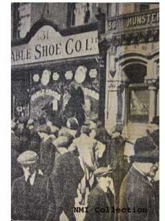 Most of the looting took place in the first three days, amid the crossfire between the rebels and the British Army Regiments, but before the fires took firm hold in the central streets. Lower Sackville Street was a focal point, with clothes, toy and sports shops proving popular. Noblett’s and Lemon’s confectioners shops were looted for chocolates and sweets; the toffee axe may have come from one of these. The Cable Shoe Company (pictured) had its windows smashed, and The Daily Mail reported that people were seen trying on boots and shoes, and returning for another pair if the first selection failed to fit correctly.