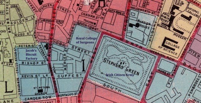 The Jacob’s complex, where the National Archives and DIT Aungier Street now stands, took up a large area between Bishop Street and Peter Street, and was closely surrounded by mostly tenement housing. It was positioned between Portobello Barracks and the city centre and its tall towers made it ideal for sniping – it was therefore a good position to try to cut off military reinforcements travelling to the centre of action.