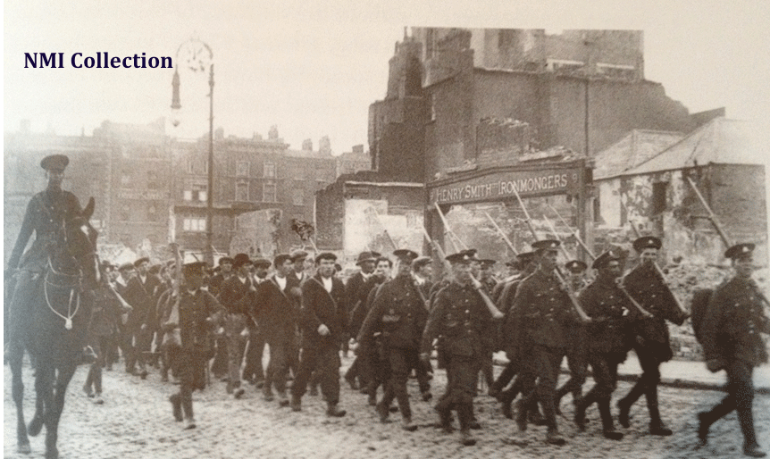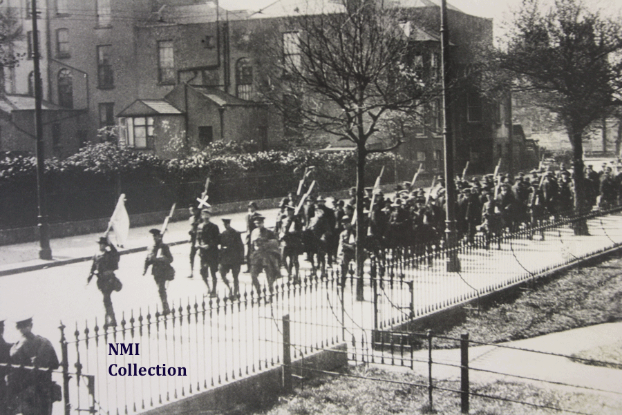 After a week of fighting and widespread destruction in the centre of Dublin, Patrick Pearse ordered the surrender of the Irish rebels on Saturday 29 April. De Valera was in command of the garrison stationed at Boland’s Mills in the Ringsend area of the city and the outlying posts around Northumberland Road and Mount Street Bridge, which saw heavy action and many casualties. On Sunday Elizabeth O’Farrell arrived at Boland’s Mills with a surrender order written by Pearse. Though at first there was some confusion over the order, the garrison, led by de Valera, marched out of the mills along Grand Canal Street towards a barricade manned by the Sherwood Foresters and surrendered their arms. They were held overnight on the grounds of the Royal Dublin Society at Ballsbridge, and transferred the next morning to Richmond Barracks. There began the military’s task of deciding what to do with the insurgent prisoners, of which there were about 600 and rising, with some being sent to England and Wales for internment, and others detained to be tried in Ireland.